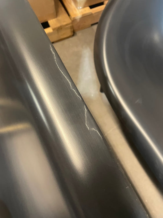 The Brass powder-coated frame is a discontinued finish. There is a 4” scratch on the edge of the backrest (see photos).
